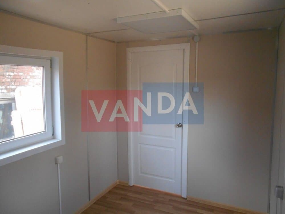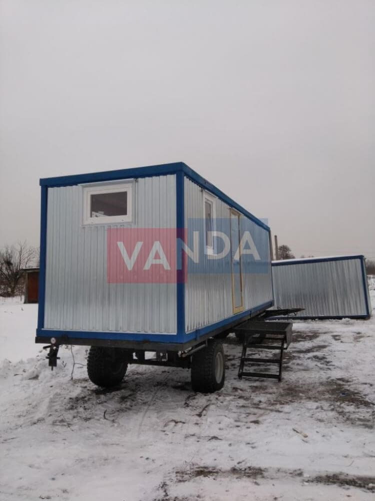 Контейнер на колесах состоит из металлического каркаса, который выполнен из профиля и укреплен сварным швом. Крыша покрыта листовым холоднокатанным окрашенным сварным металлом. Внешняя сторона стен обшита оцинкованным профнастилом. Внутренний каркас вагончика изготовлен из бруса. По всему периметру помещение утеплено и пароизолировано. Внутренняя отделка осуществляется по выбору заказчика. Это может быть вагонка или оргалитовые листы. Пол вагончика состоит из обрезной доски, пароизоляции, утепления поверх которого уложены ДСП. Вагончик оборудован дверью из оргалита и деревянными окнами с двойным остеклением.
